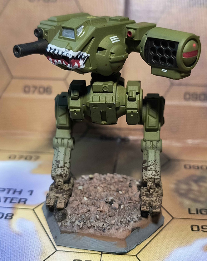 Bravo configuration is a pure brawler focusing on pulse lasers. Each arm mounts an assembly of a large pulse laser and a pair of medium pulse lasers, all which are benefiting from the higher than average speed of the Argus. A Beagle Active Probe allows the Bravo to detect hidden enemy units before cutting them apart with pulse fire. Extra heat sinks help manage the massive heat load of all those lasers.